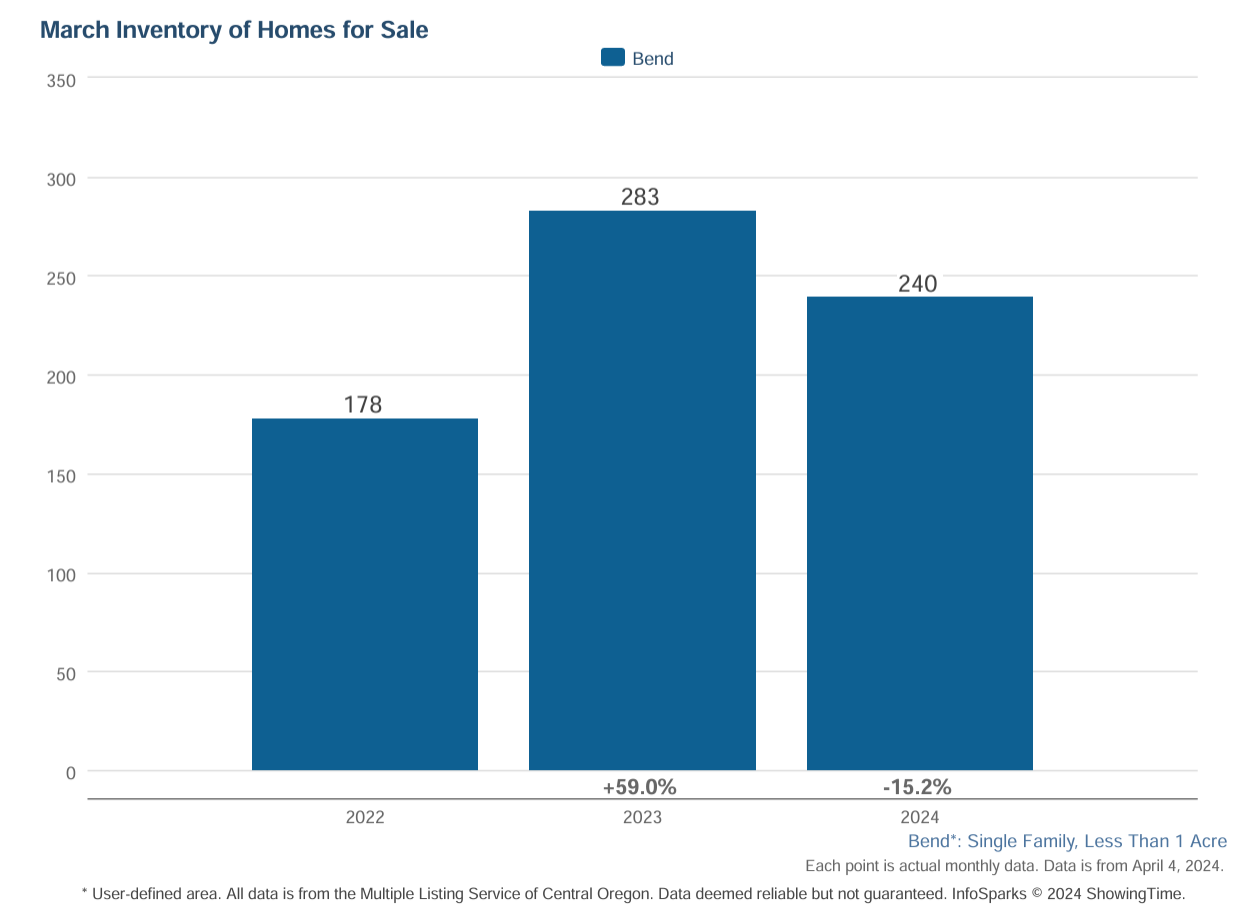 When March 2024 is compared with March 2023 for Bend single family homes on less than an acre, the following trends are noted: